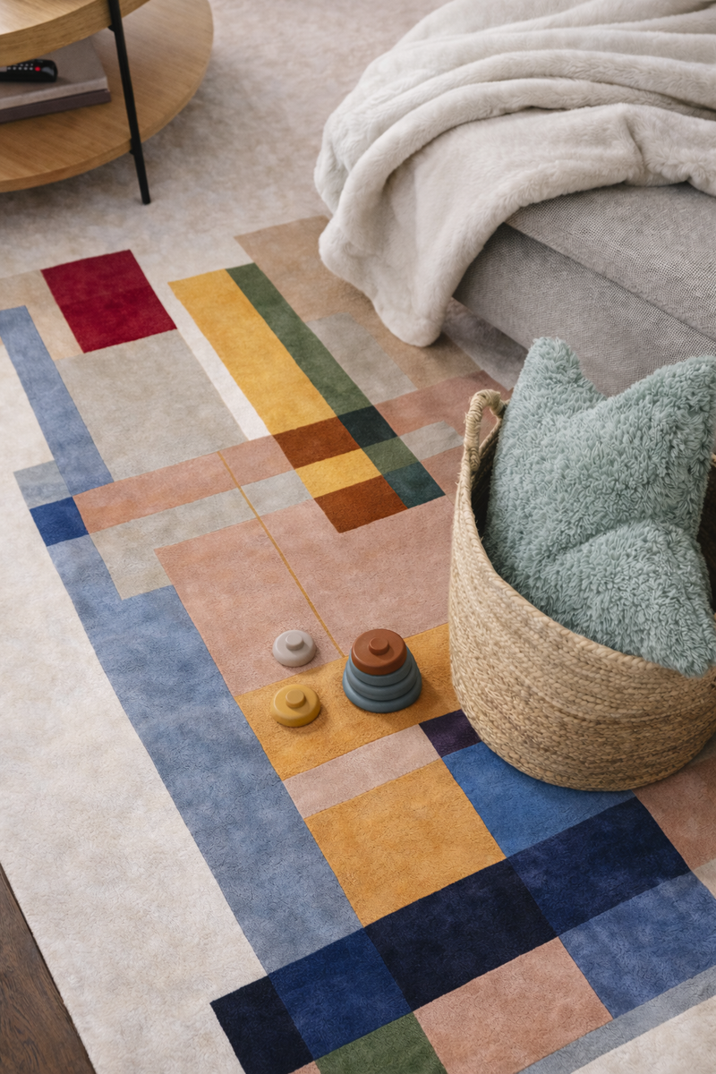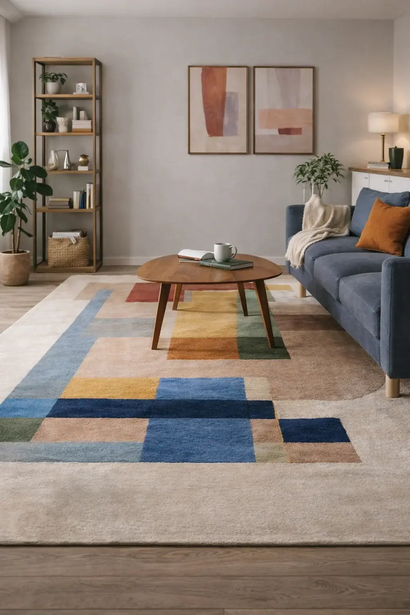 Das Design des gezeigten ArtisticFlux-Modells beeindruckt durch seine kompositorische Balance aus geometrischen Formen und intensiven Farbflächen. Warme Beige- und Cremetöne bilden die ruhige Basis, während kräftiges Rot, Gelb, Grün und Blau dynamische Akzente setzen. Pastelltöne wie Rosé und Lavendel erzeugen eine harmonische Verbindung zwischen den kontrastreichen Elementen. Diese moderne Farbarchitektur erinnert an abstrakte Kunstwerke des 20. Jahrhunderts und macht jeden Raum zu einer Galerie.